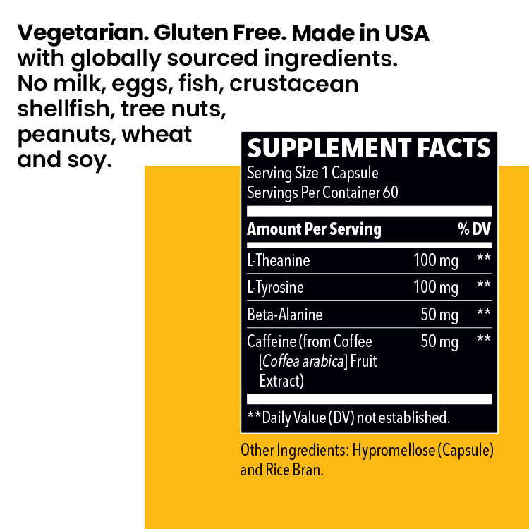 Contains 50 mg of caffeine, half the levels found in a cup of coffee, so you feel alert without the jitters, energy crashes, stomach aches, or sleep interruptions.*