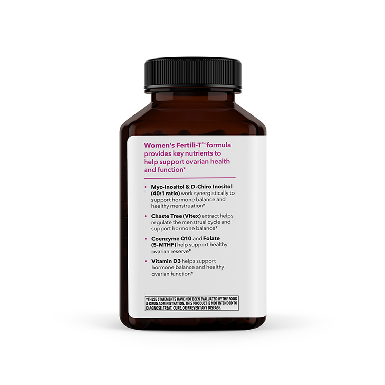 Women’s Fertili-T™ is designed to support hormone balance, ovarian function, and reproductive health in women preparing to conceive. The synergistic blend of Myo-Inositol and D-Chiro Inositol (40:1 ratio), Chaste Tree, Methylated Folate, CoQ10, and Vitamin D promotes healthy ovulation, egg quality, and a receptive uterine lining. These ingredients support the entire fertility cycle—from hormonal balance to cellular energy and uterine health.*